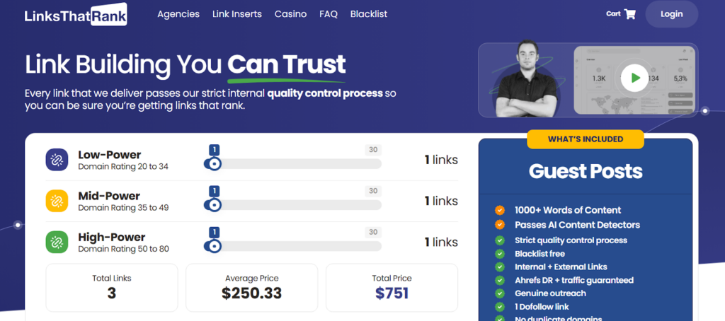 LinksThatRank is known for delivering high-quality editorial backlinks through a strict vetting process. They focus on premium sites with strong authority metrics, making them a go-to choice for brands that want higher-DR placements and are comfortable paying a premium.